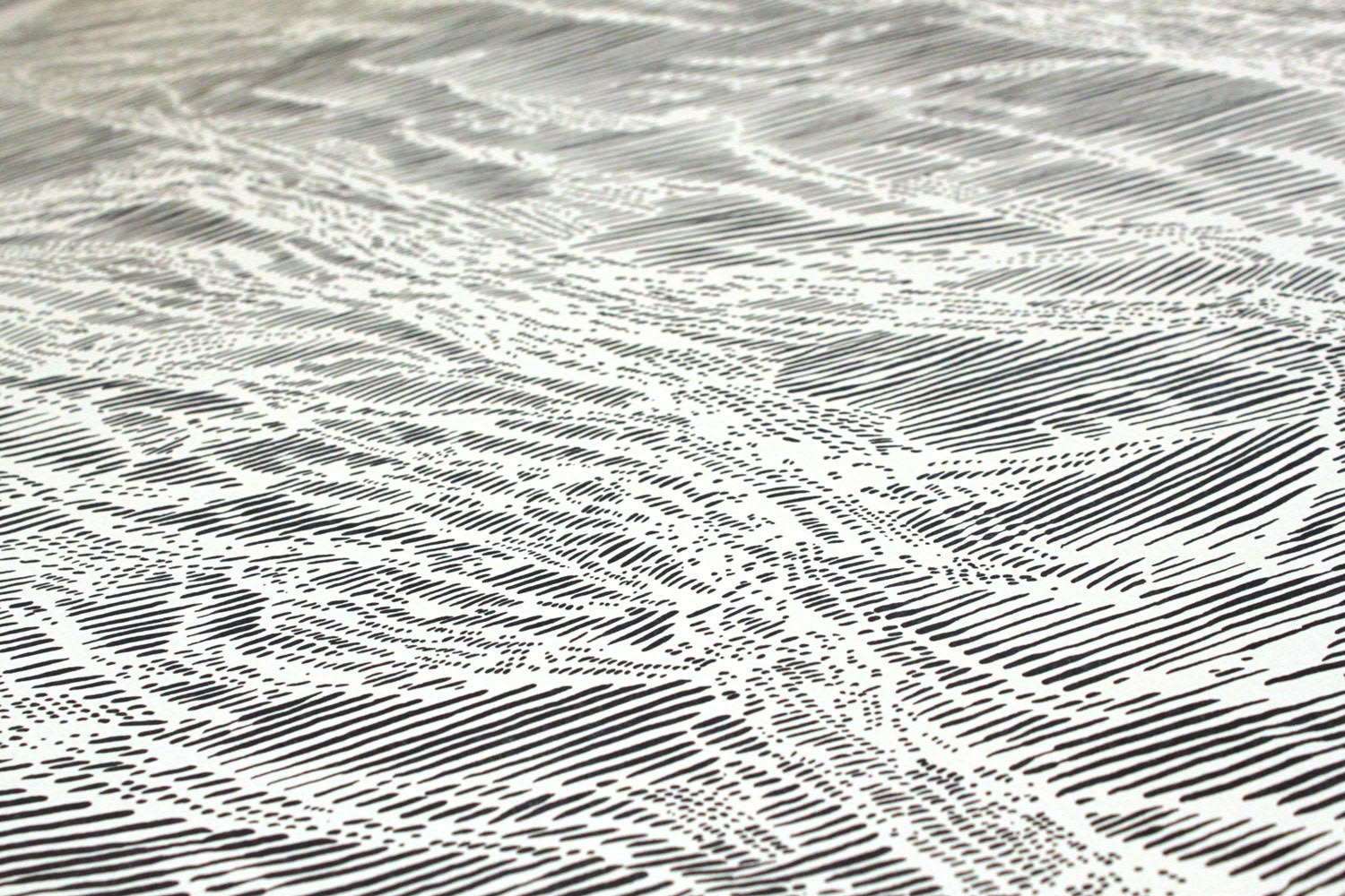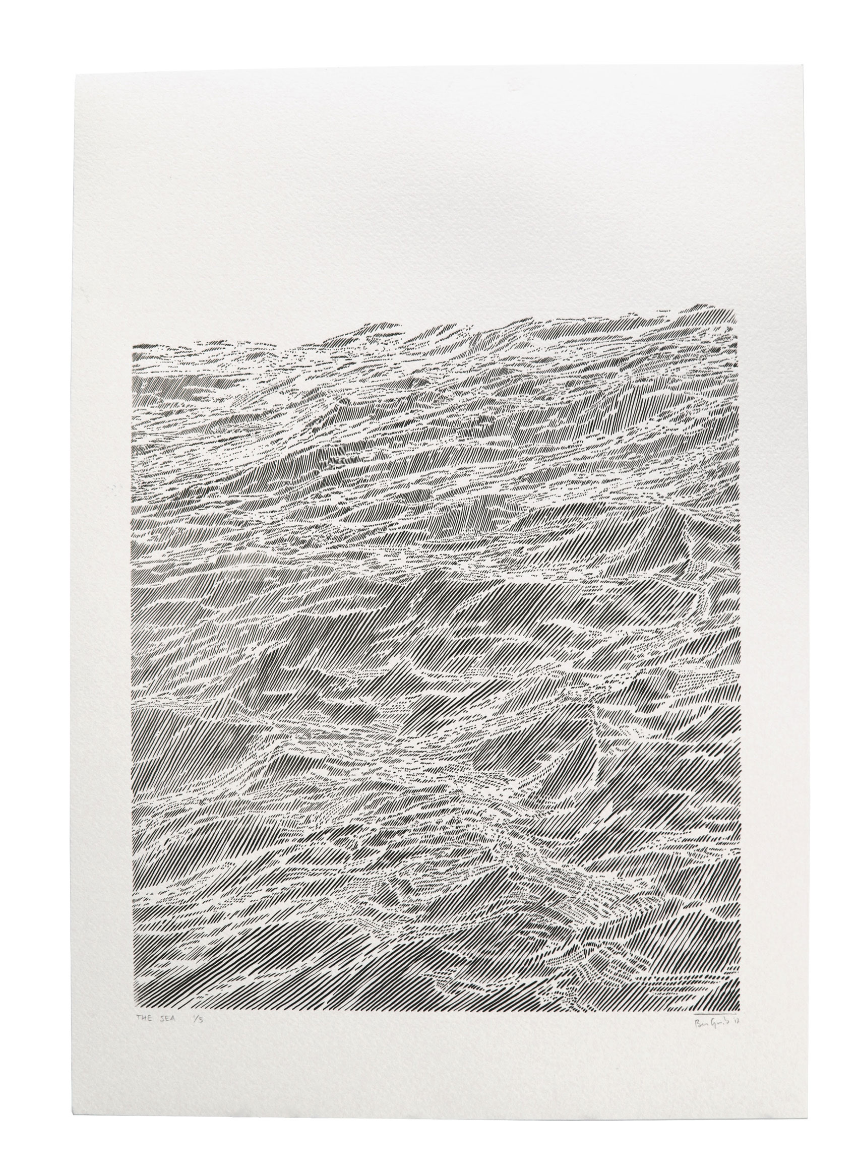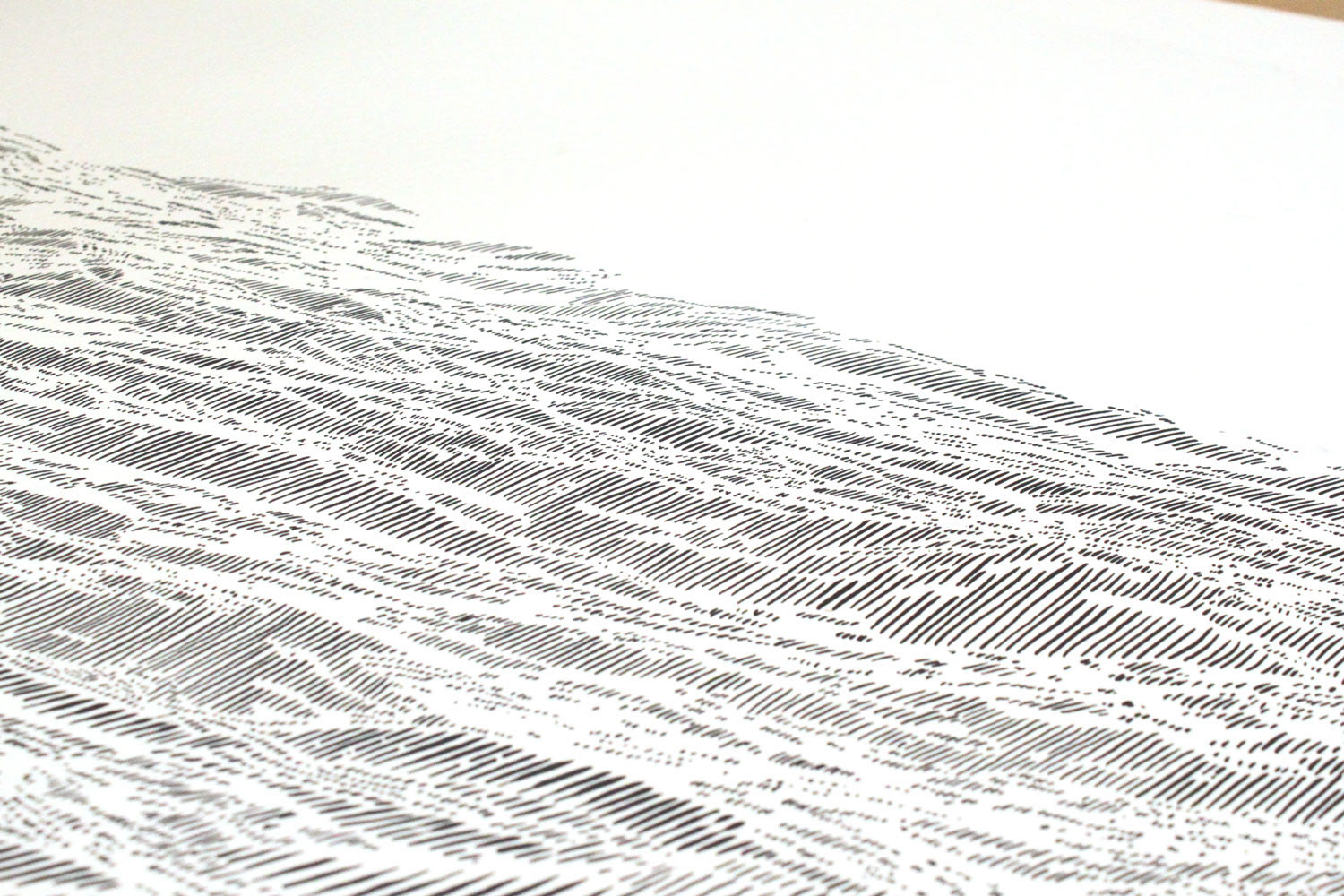 A handdrawn seascape that is letterpressed on some cotton rich paper.